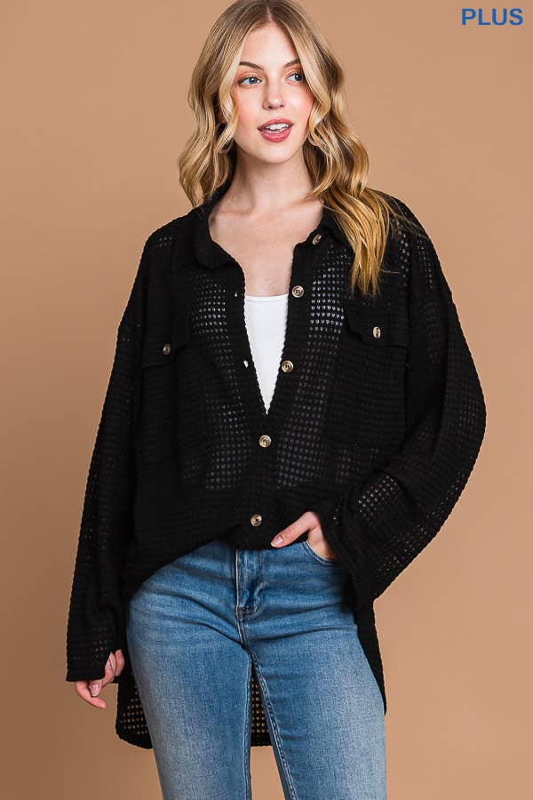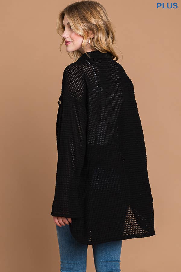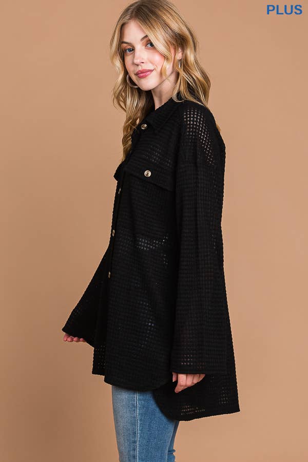 Oversize -Button Down -Solid Shacket -Long Sleeve -Front Pockets Detail -Loose Fit -Oversize Waffle Hacci