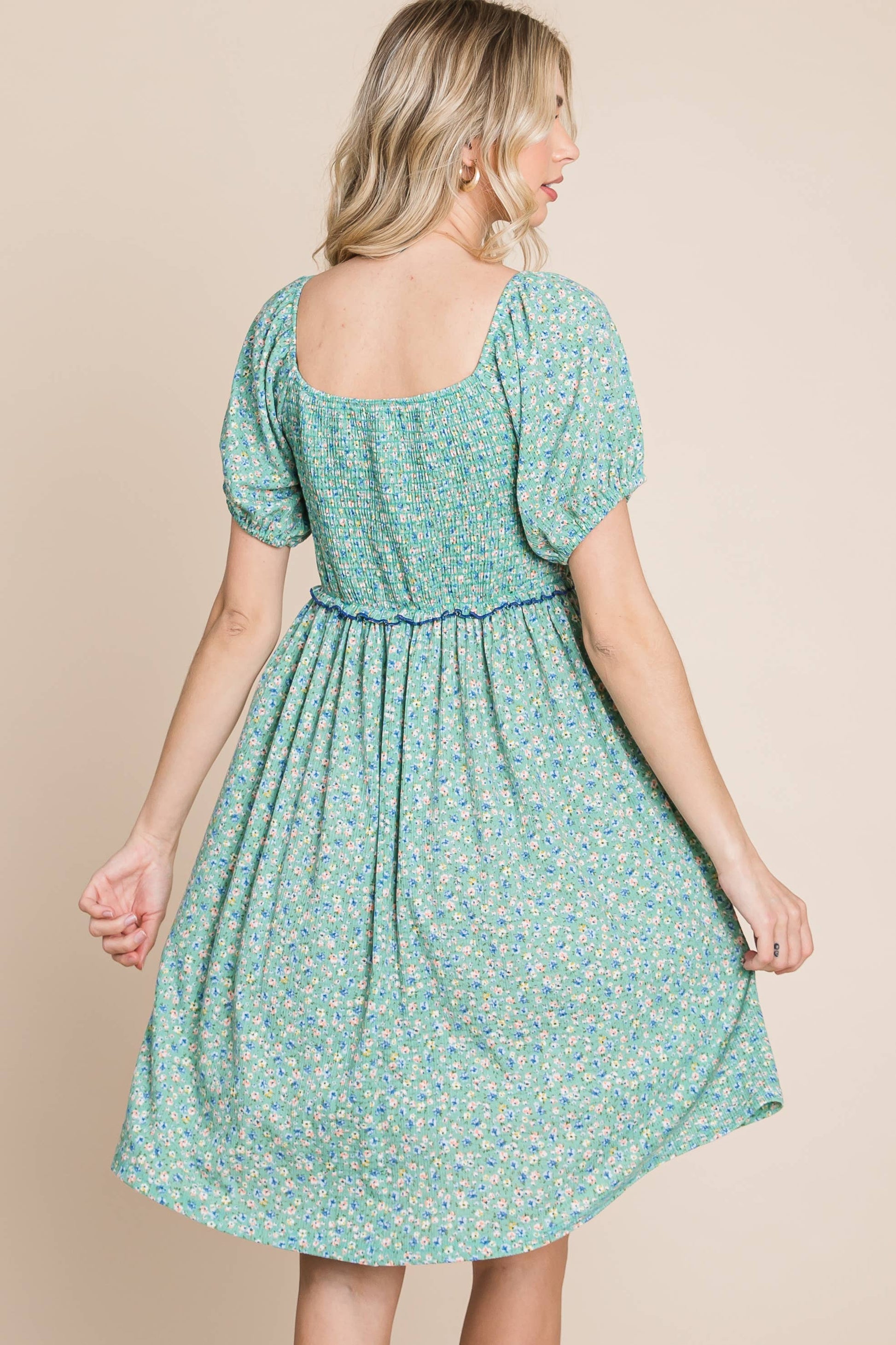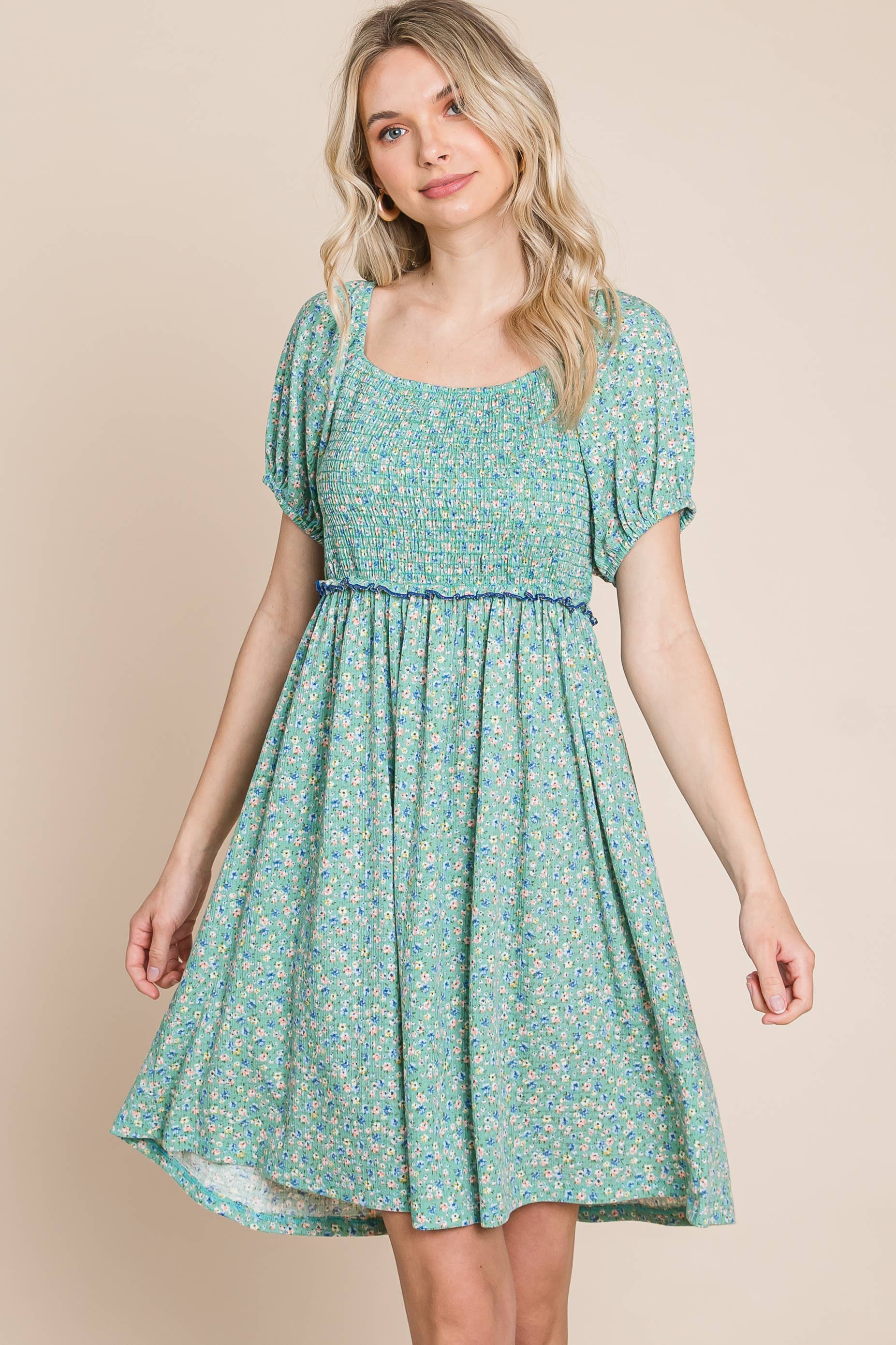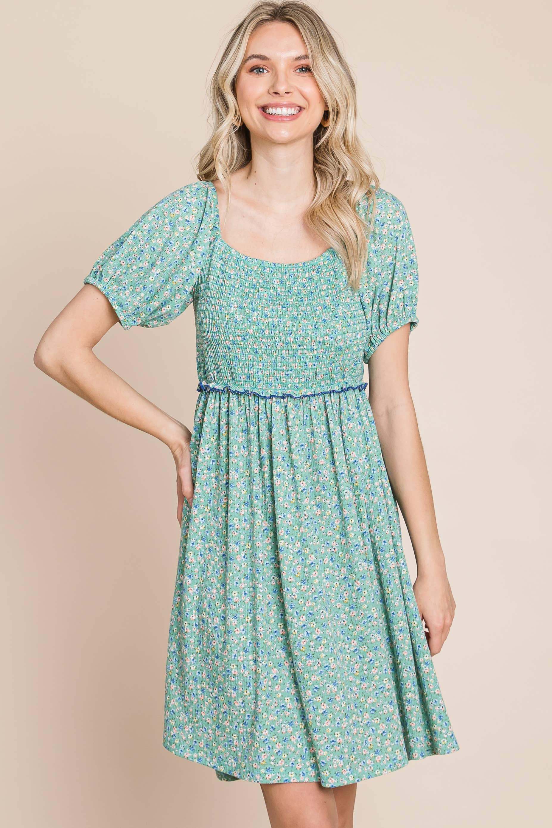 Feel beautiful and confident in our Plus Size Mini Floral Smocked Dress — a perfect blend of comfort and feminine charm. Featuring a flattering square neckline, delicate puff sleeves, and an elastic ruffle-trim waistband, this babydoll dress moves with you effortlessly.
