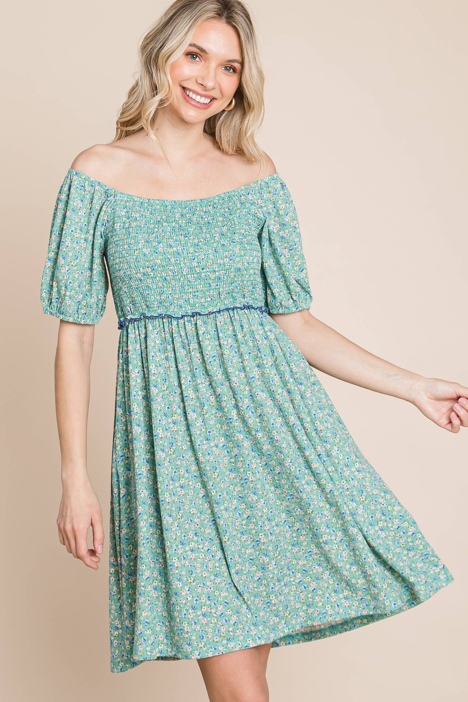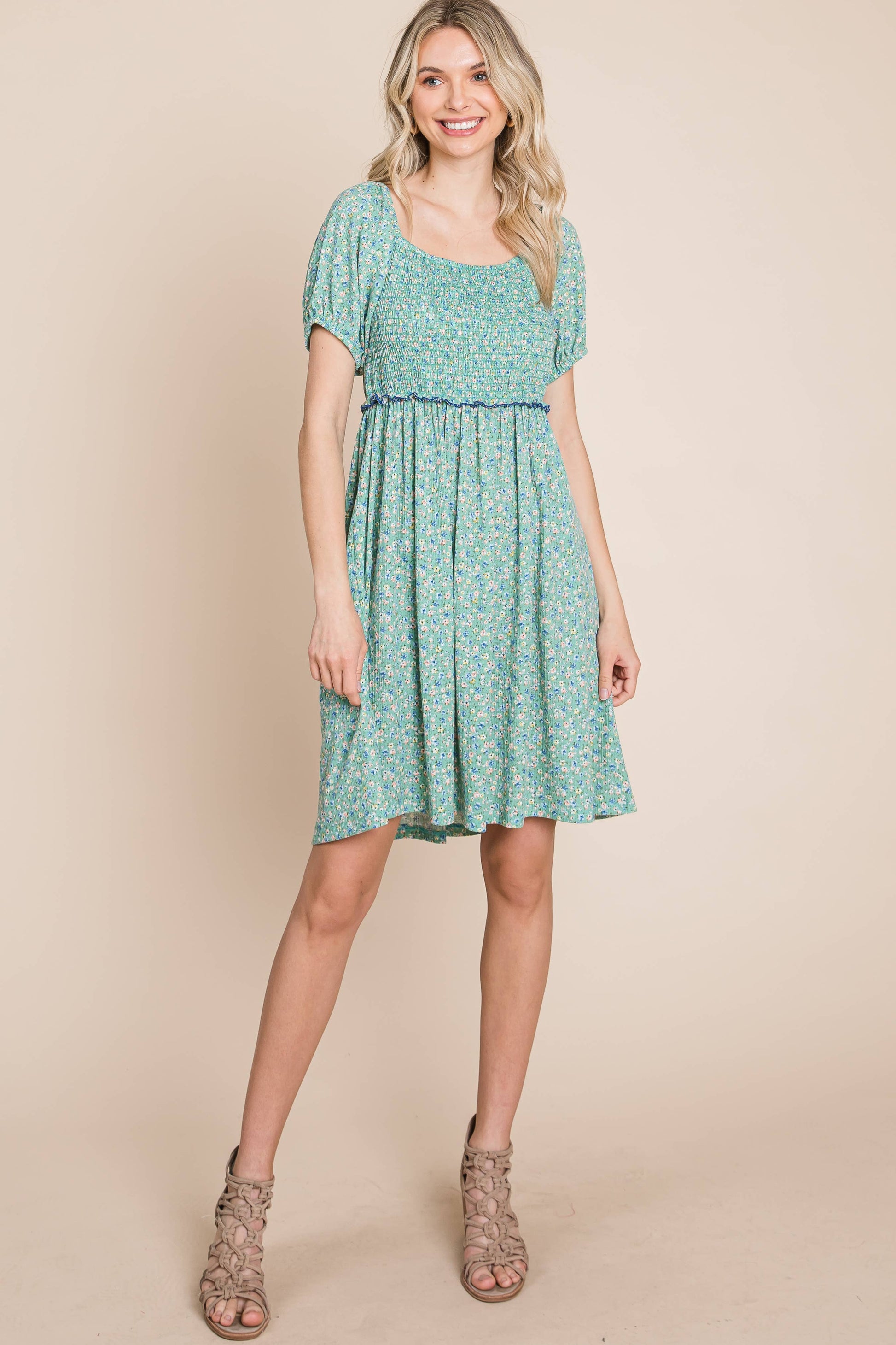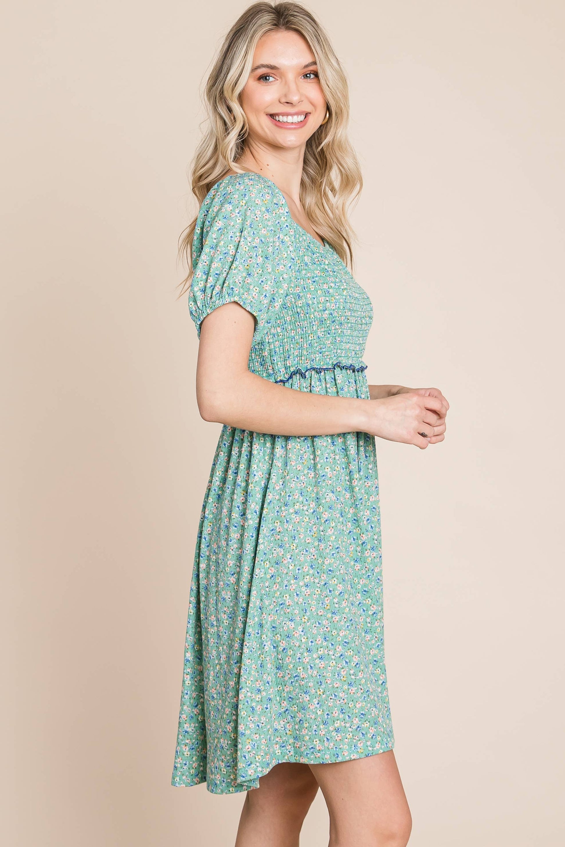 Feel beautiful and confident in our Plus Size Mini Floral Smocked Dress — a perfect blend of comfort and feminine charm. Featuring a flattering square neckline, delicate puff sleeves, and an elastic ruffle-trim waistband, this babydoll dress moves with you effortlessly.