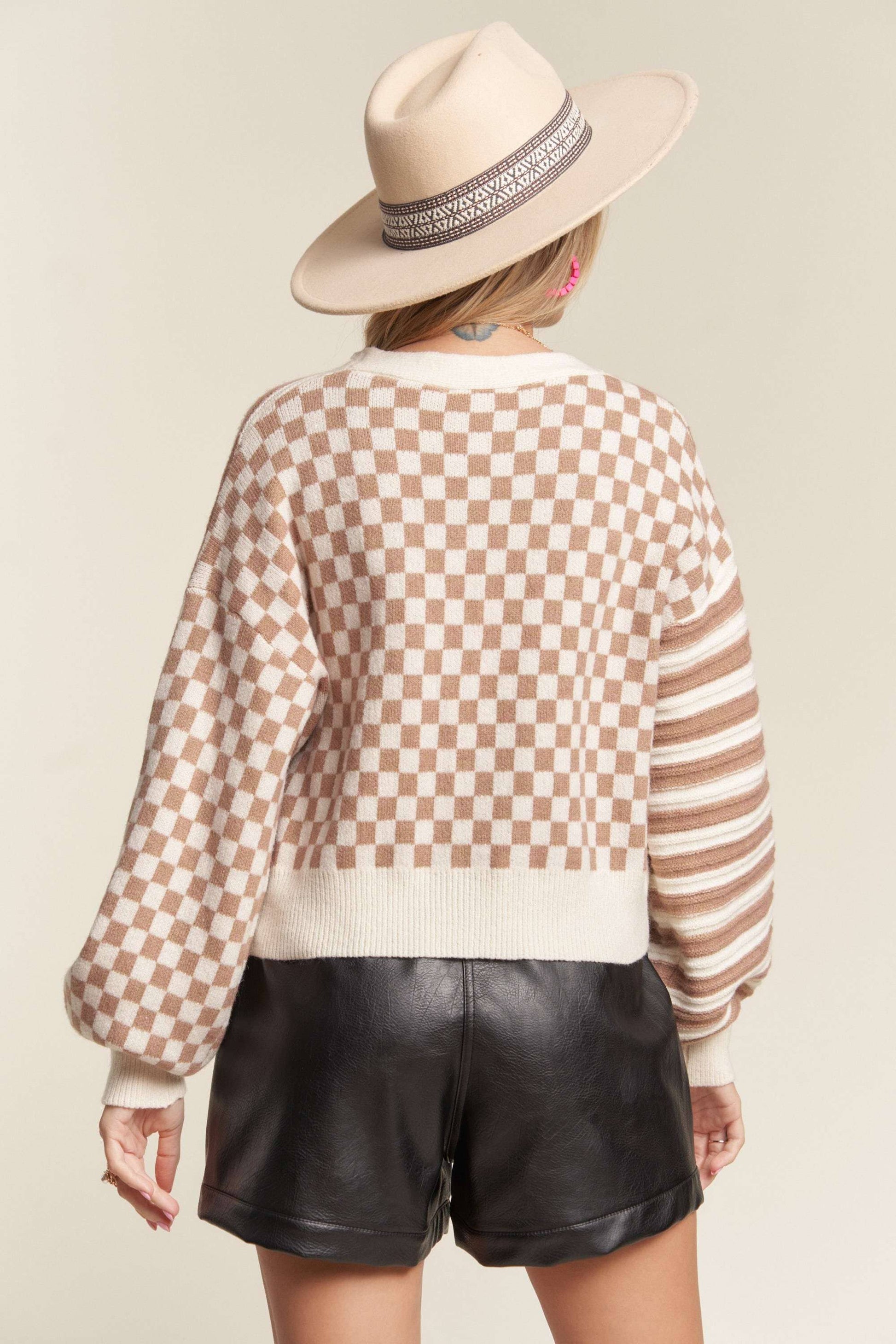 Cozy comfort and versatile Multi Pattern Cardigan! With a button down design, this checker sweater is perfect for any occasion. Stay warm and chic all winter long!