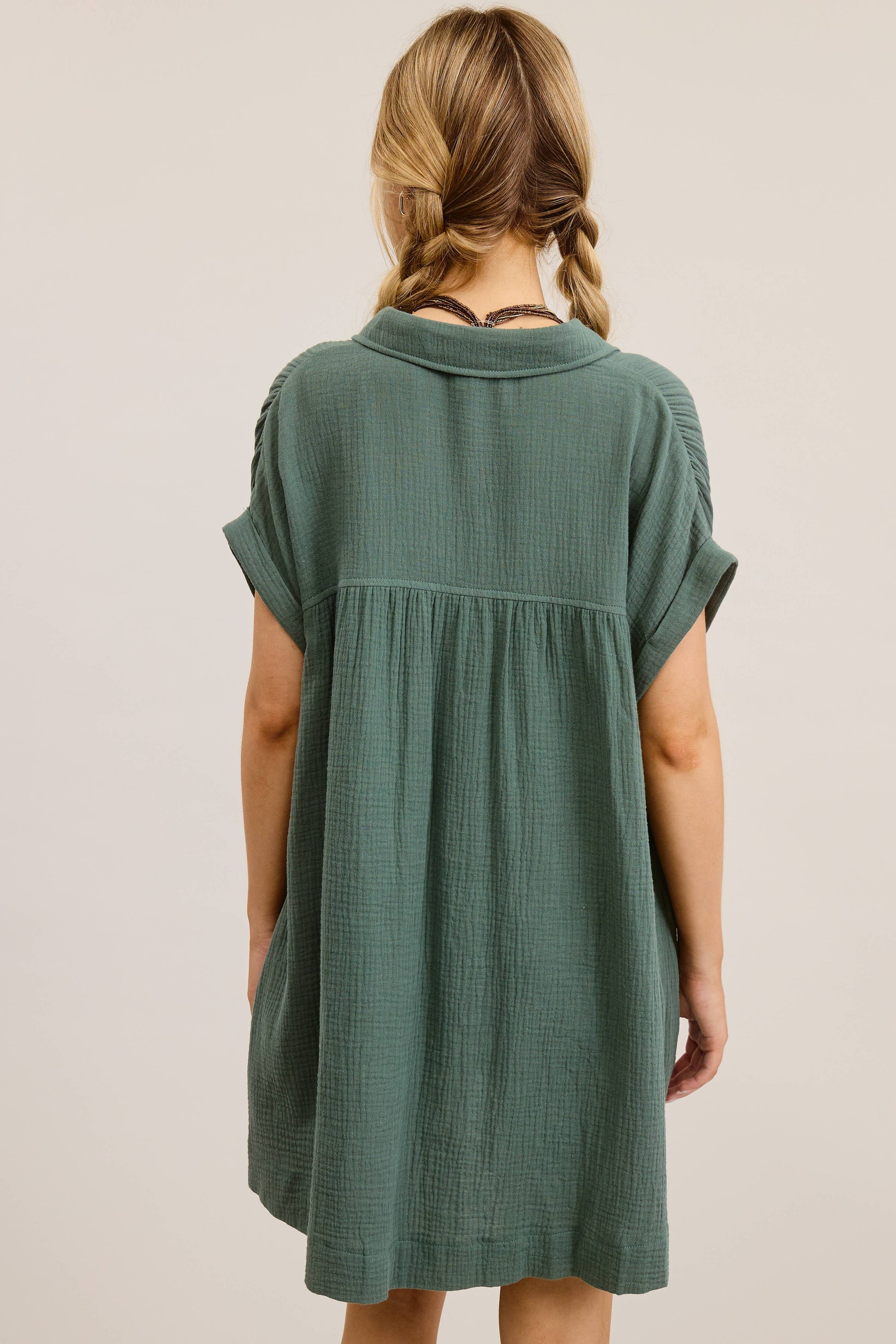 COTTON GAUZE BUTTONED SHORT-SLEEVE SHIRT MINI DRESS