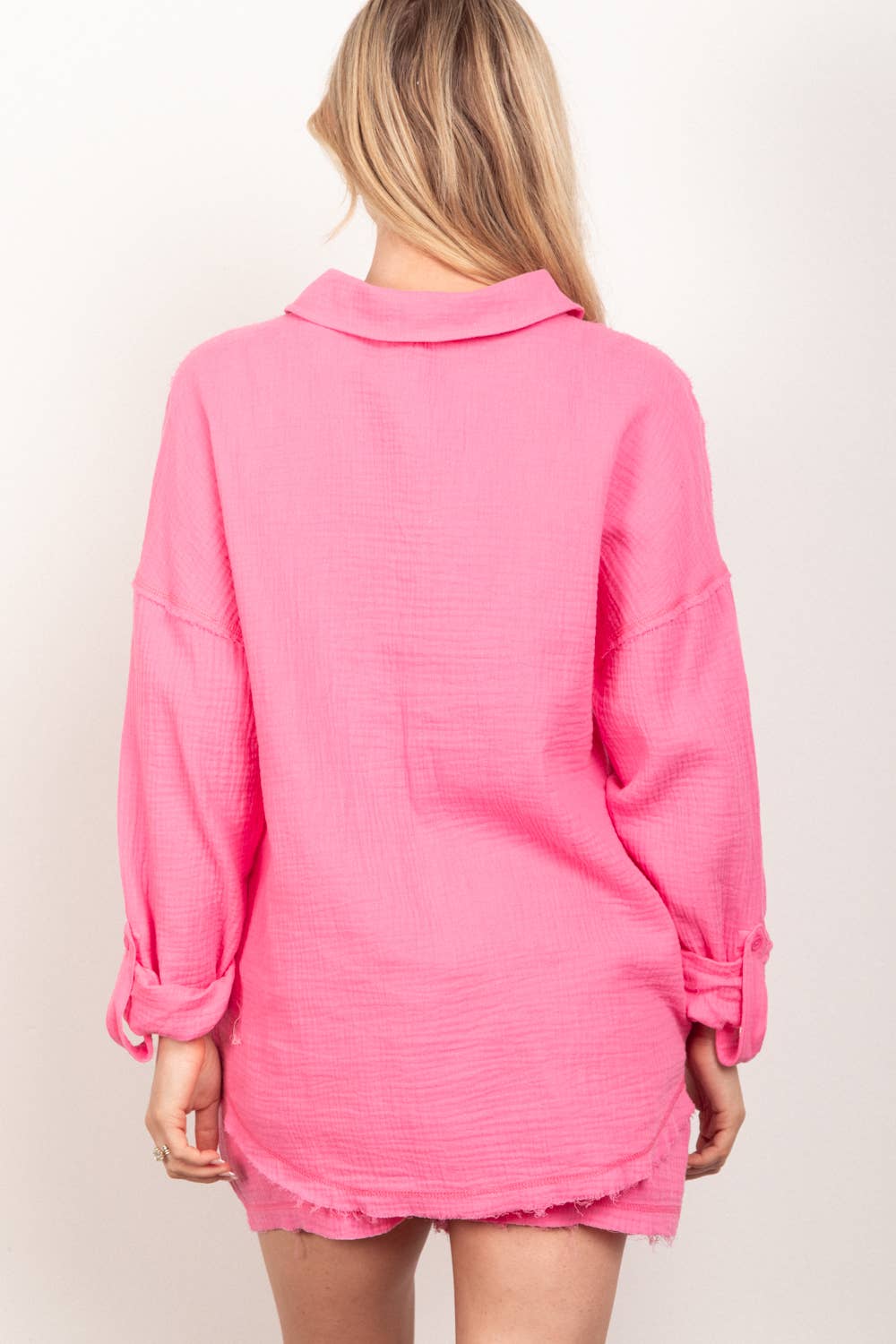 PLUS SIZE Cotton Gauze Woven Shirt Top & Shorts Set - Raw Edge Cut Hem TOP - Oversized - Drop Shoulder - Button Up - Fold Long Sleeve - Patch Pocket - Oversized Shirt - Elastic Waist - Side Pockets - Drawstring - ShortsÂ