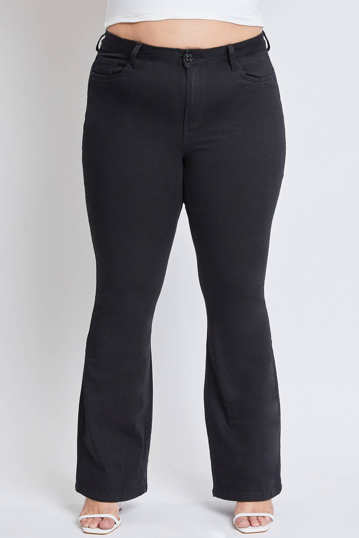 Our Plus Size Hyper Denim Super Stretchy Flare Jean is ready for work, date night, and everything in between. The super-soft fabric makes this piece even more comfortable than they look. Featuring a 5-pocket construction, single-button closure with front zip, and belt loops. These hyper denim 'fits offer you the ultimate stretch with the maximum comfort every wear. Model is wearing 1x.