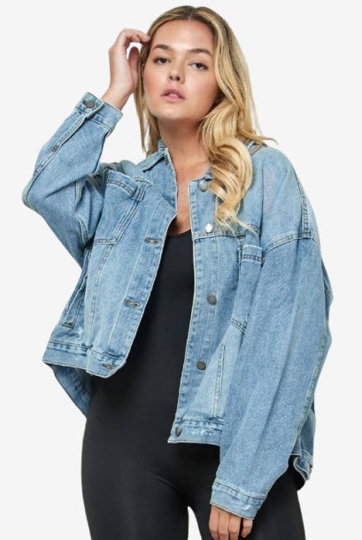 Oversized relaxed fit denim jacket. Spread collar, Button front closure, Front chest pocket. The back is pleated and has button cuff sleeves.