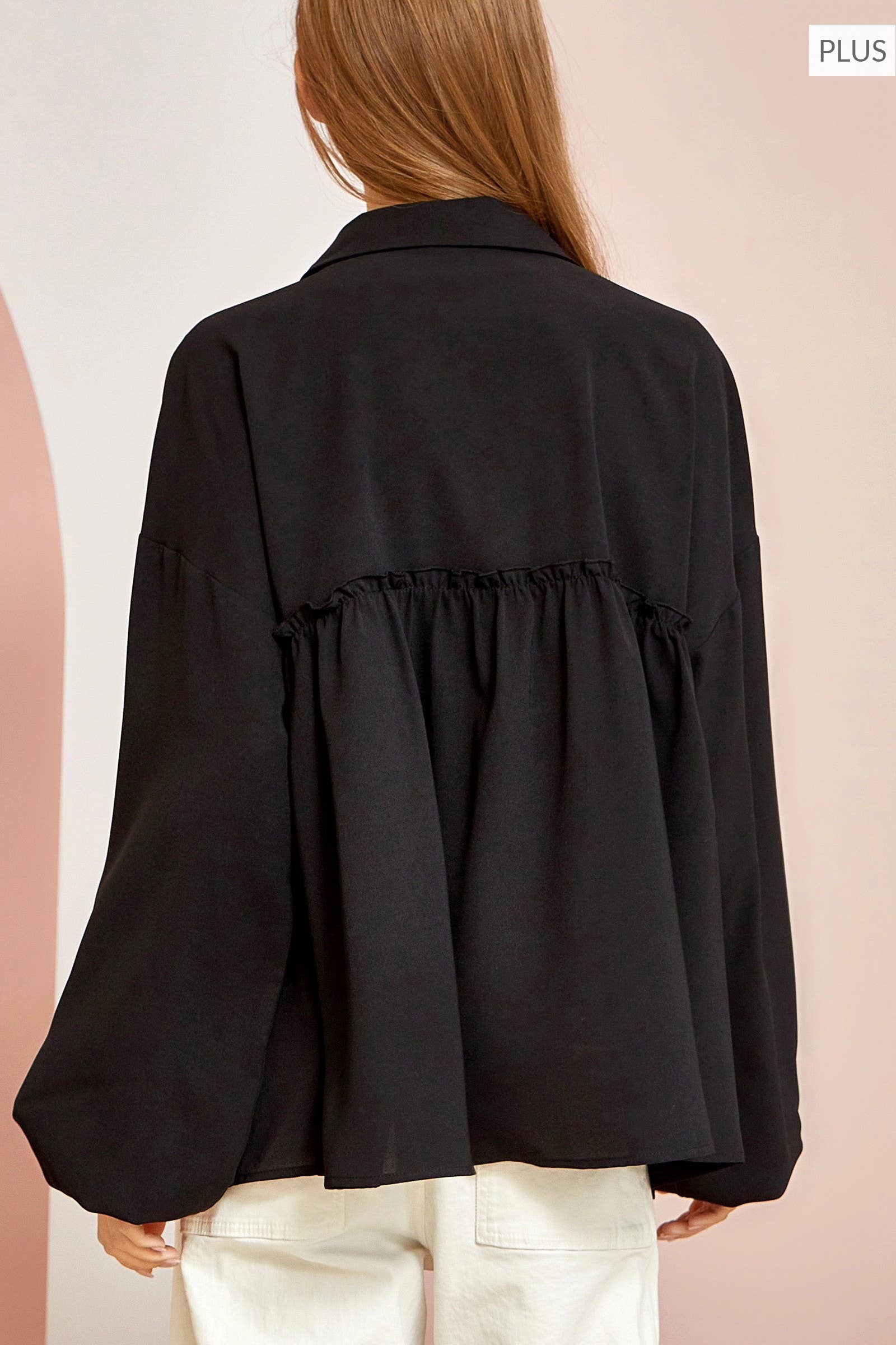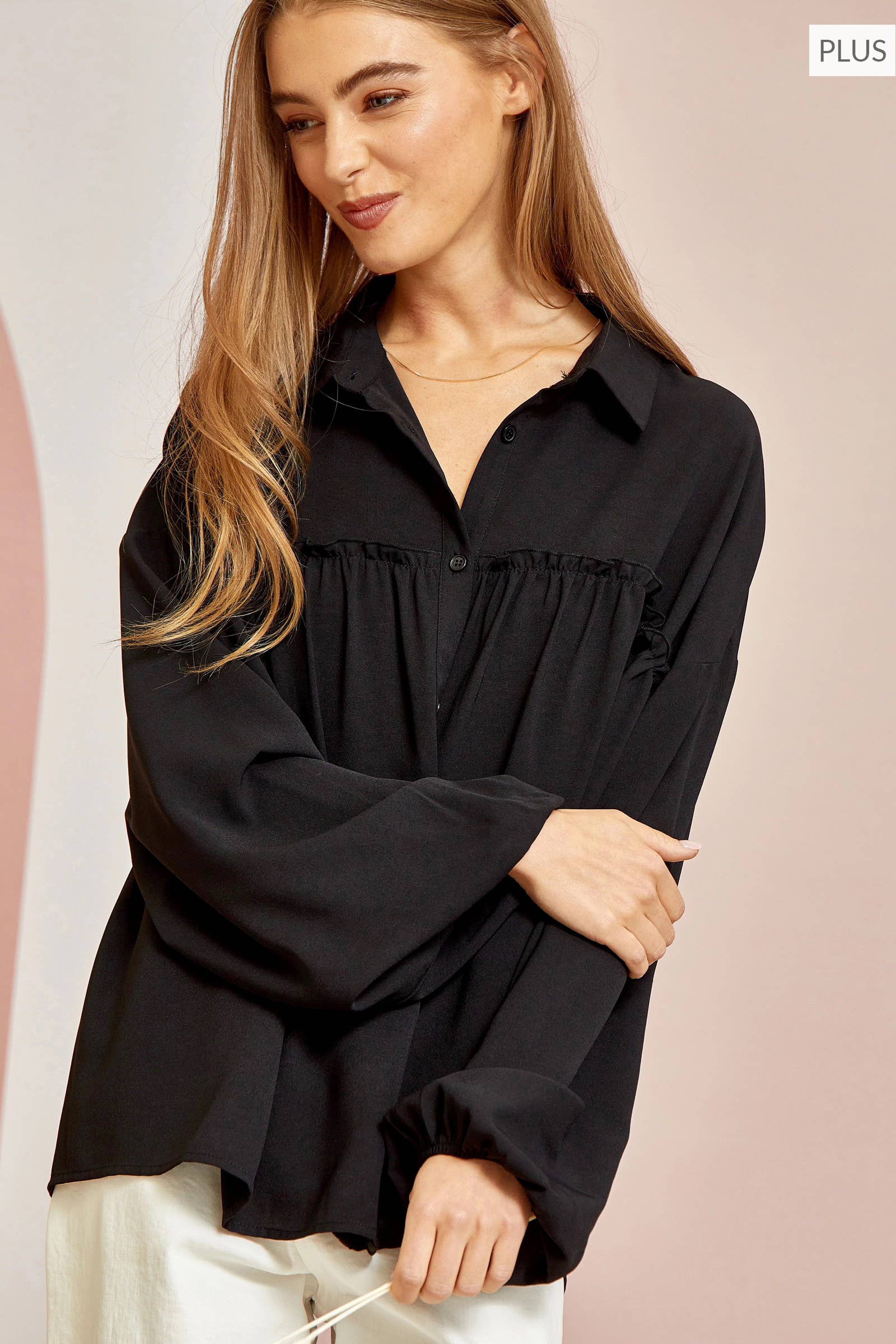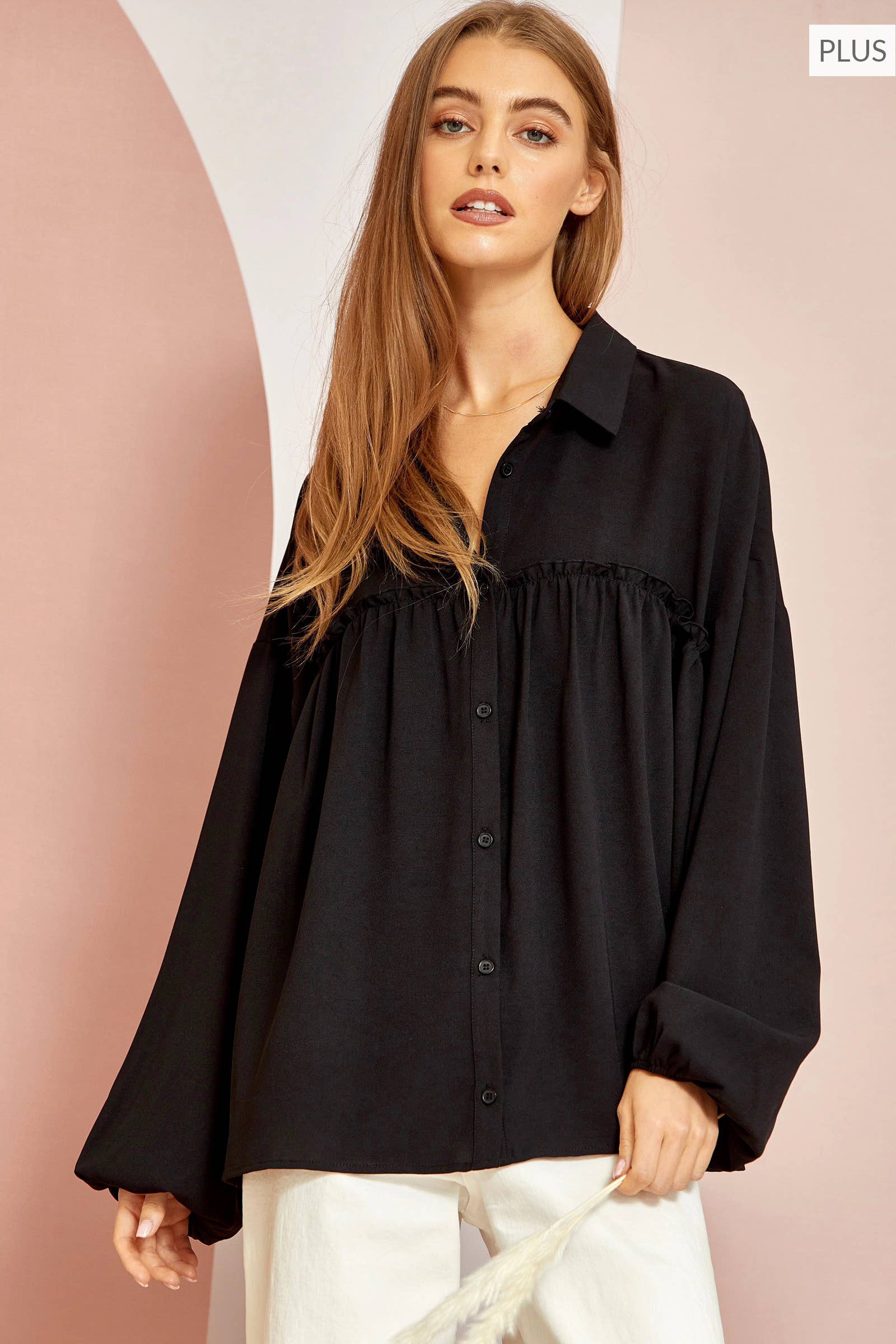 Casual oversized button-down top with ruffle detail and balloon sleeve.