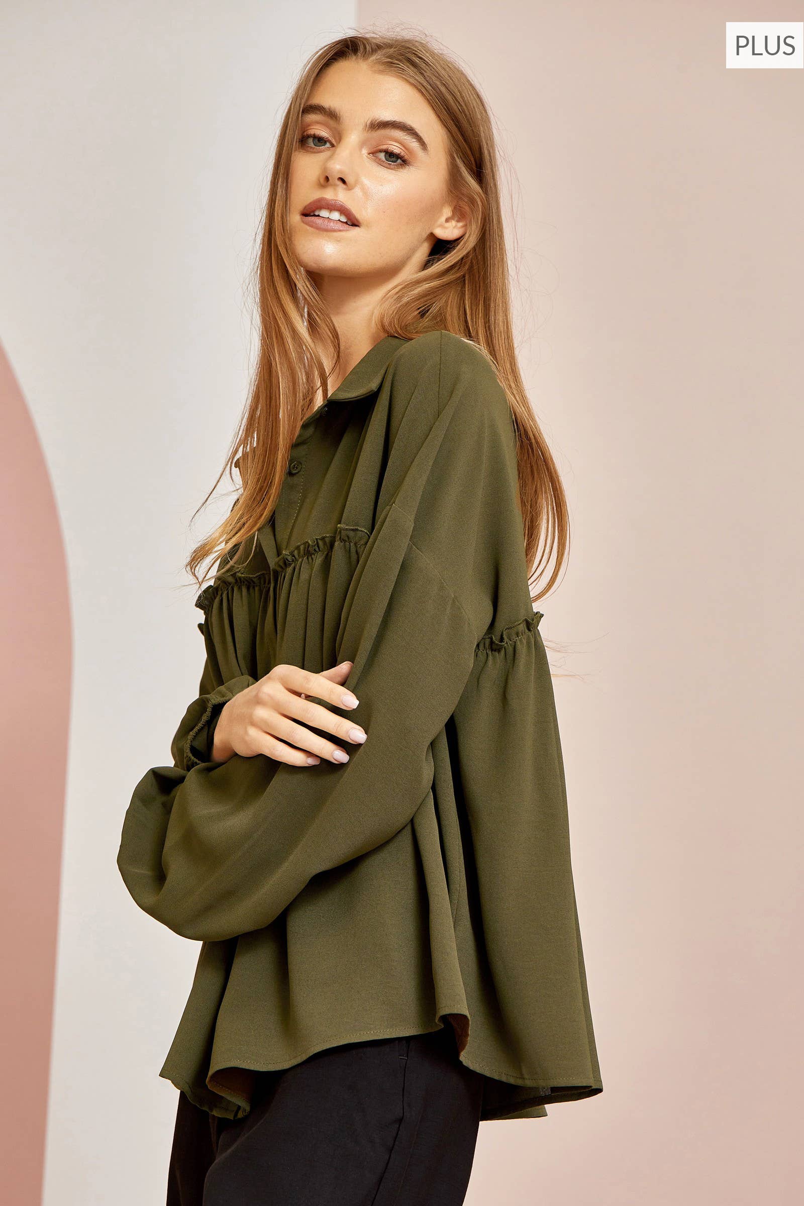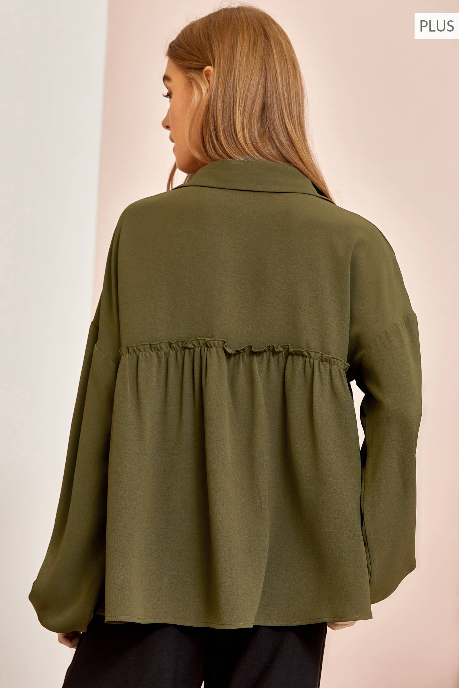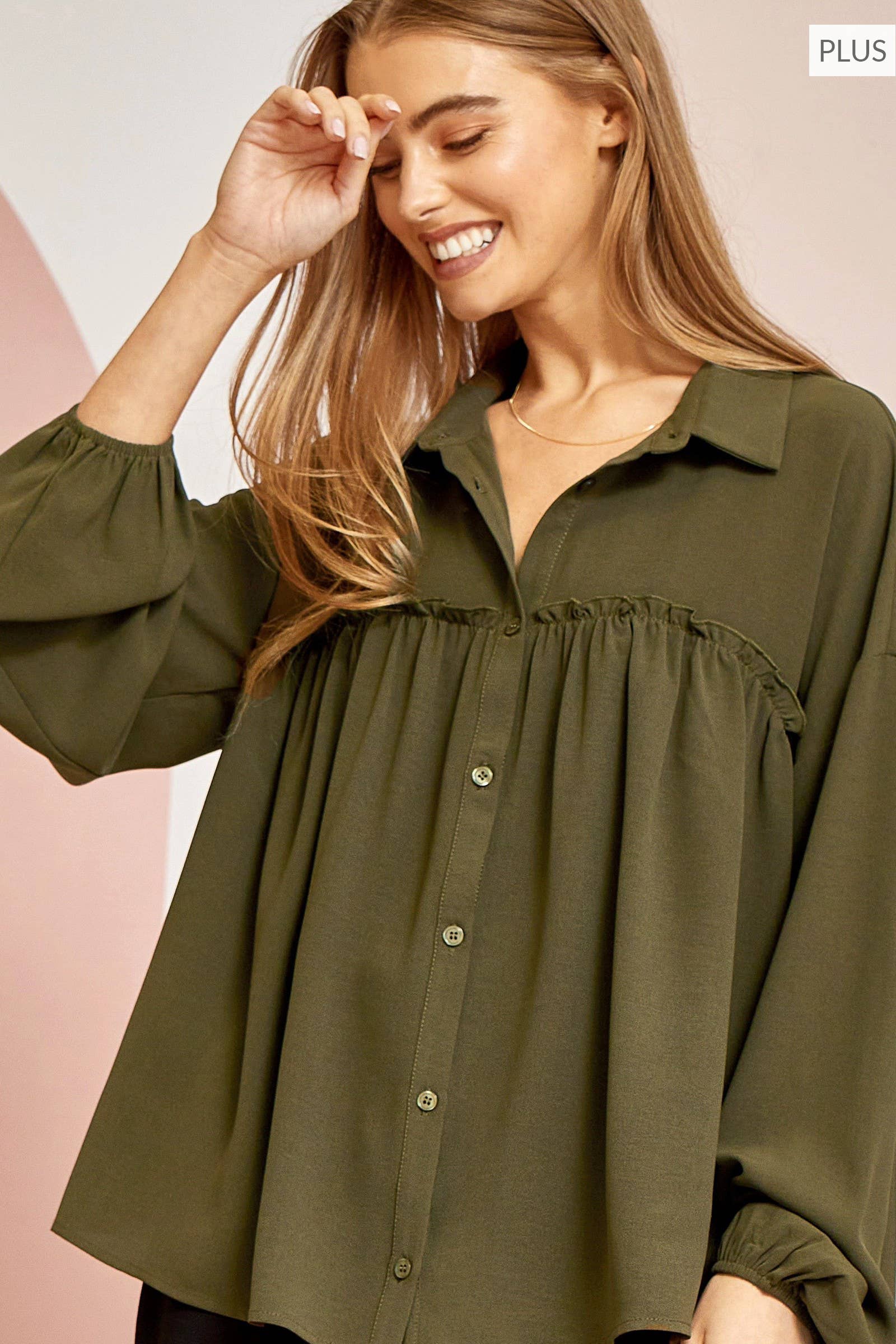 Casual oversized button-down top with ruffle detail and balloon sleeve.