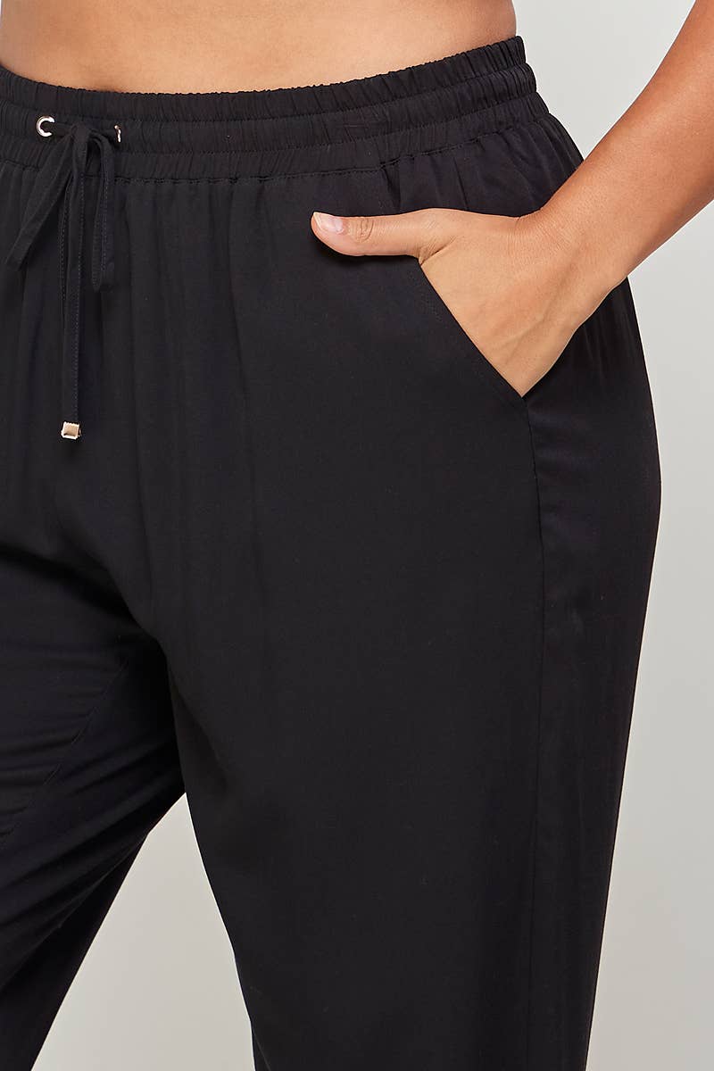 Black Plus size solid, full length, elastic-stretch high waisted pants in a relaxed fit with drawstring ties and side pockets.