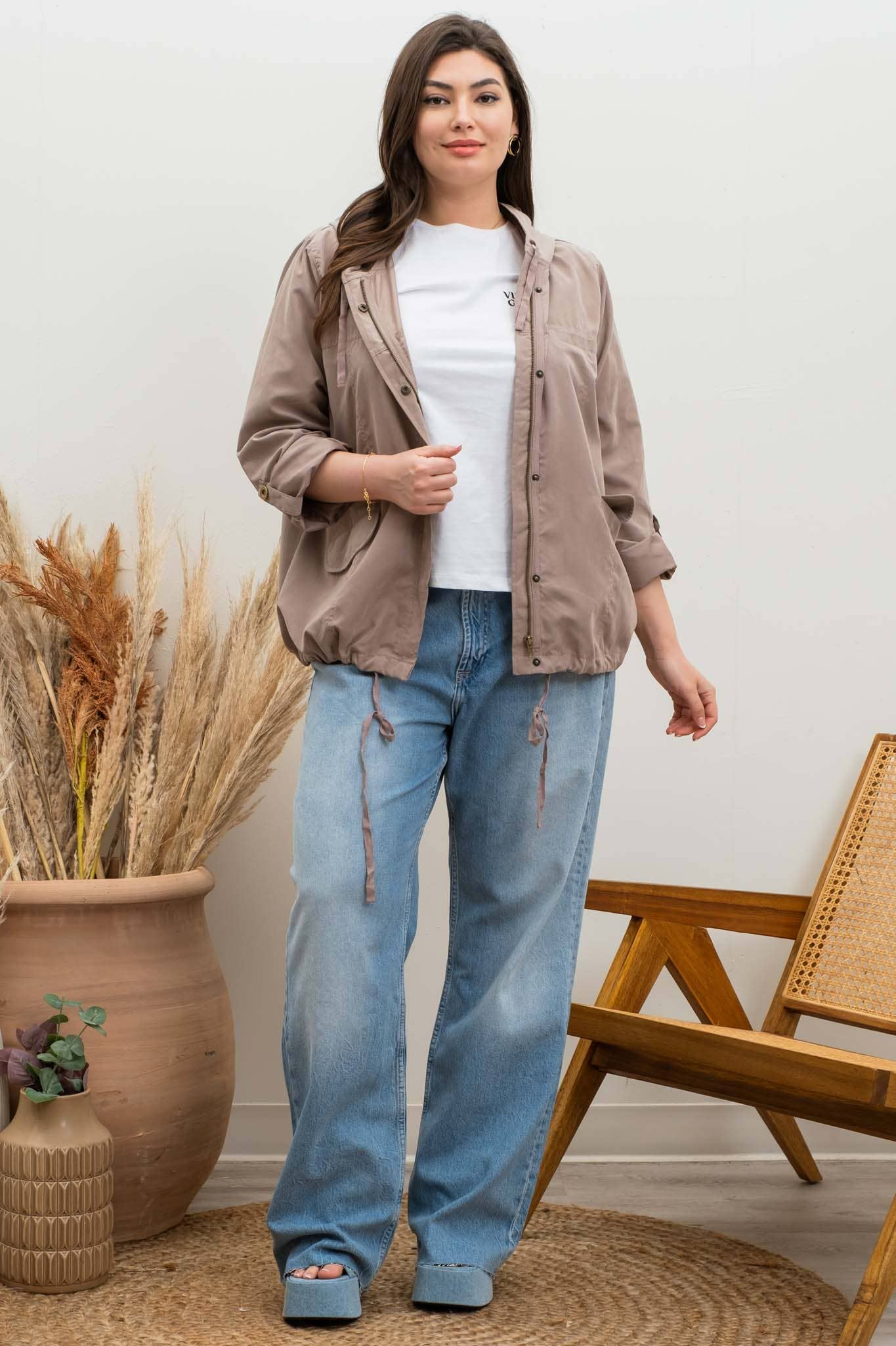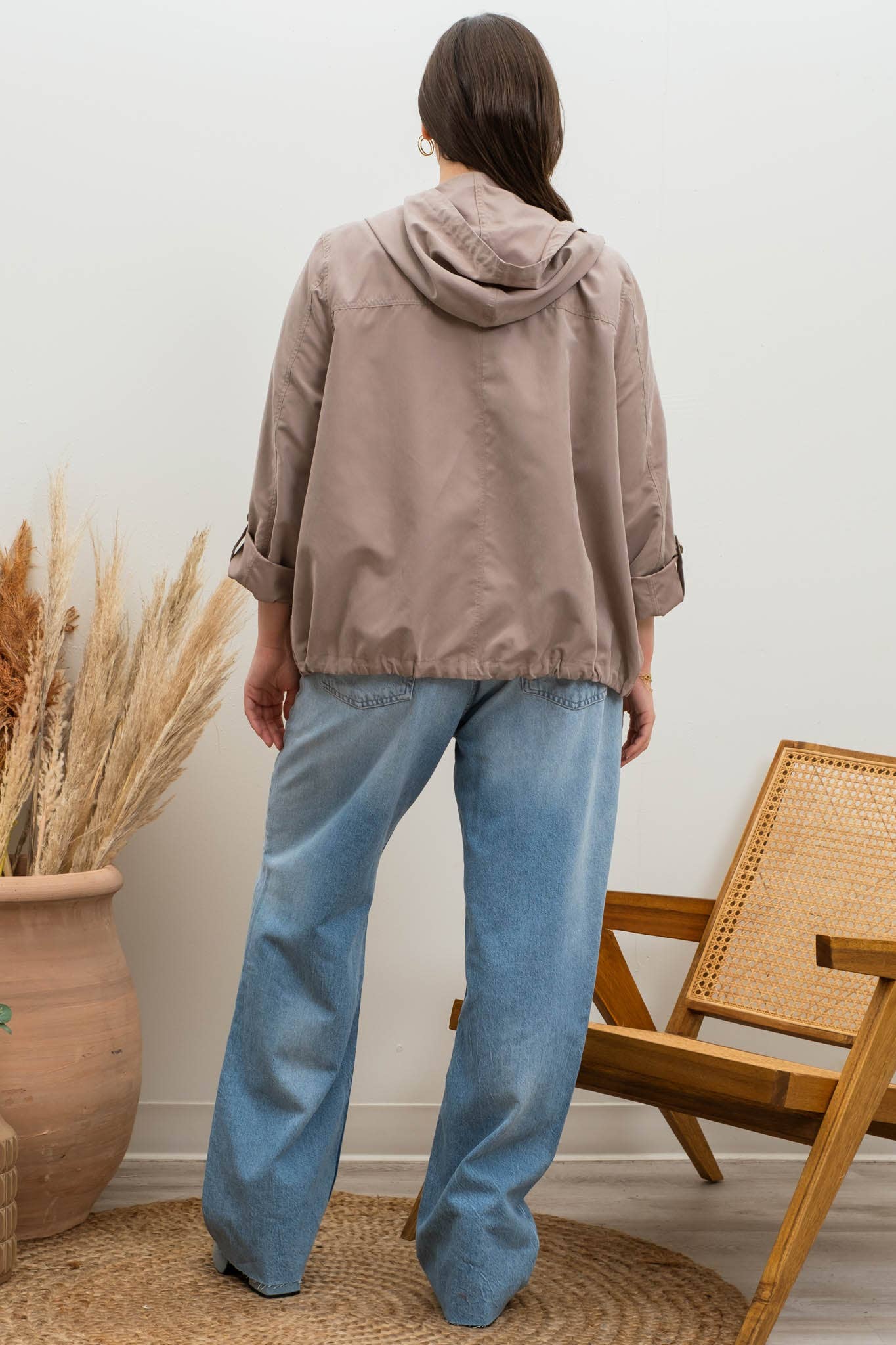 ZIPPER FRONT CLOSURE WITH SNAP BUTTONS LONG SLEEVES ROLL UP SLEEVES WITH TAB 3/4 SLEEVE HEM DRAWSTRING TIE FRONT POCKETS HOODED W/ DRAWSTRING SHELL.