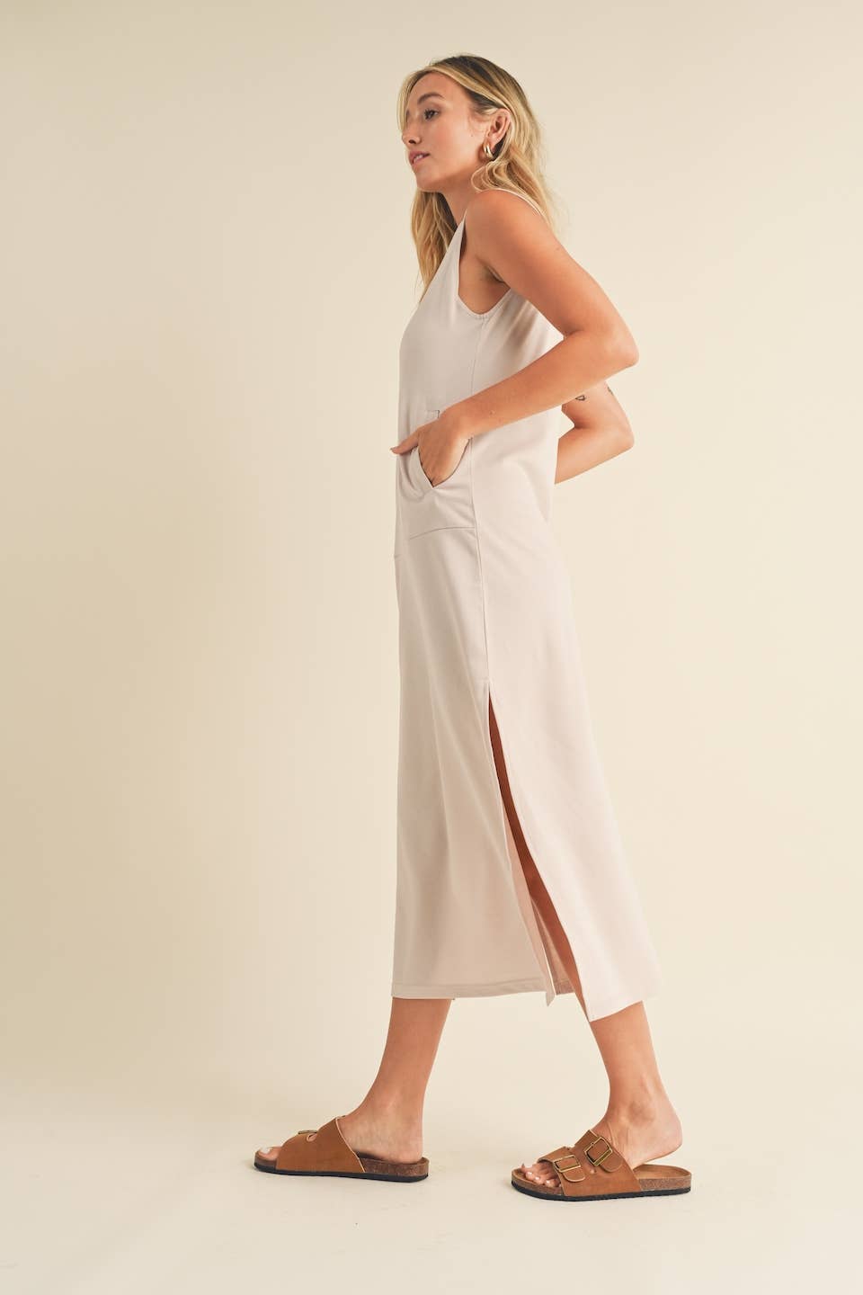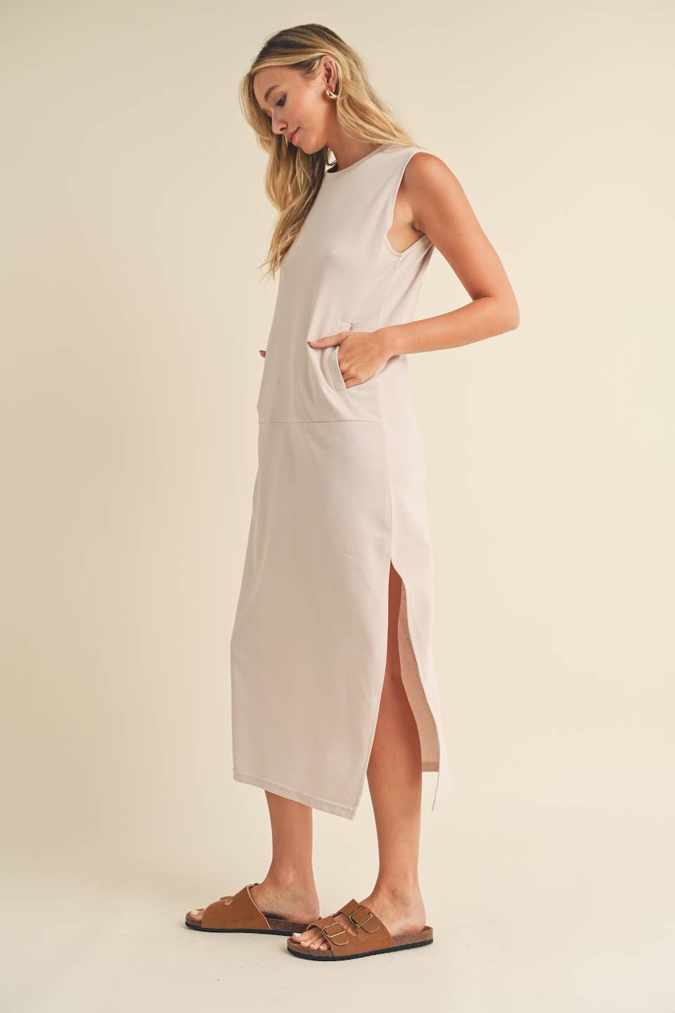 This terry cloth dress wraps you in cozy comfort with side slits for easy flow and roomy kangaroo pockets to hold what matters. Effortless style meets everyday ease—your new go-to for grounded, graceful days.
