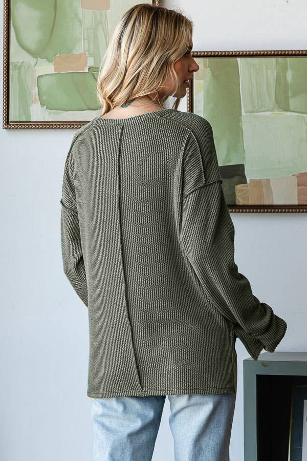 A RIB TOP FEATURING A HI LOW DETAIL, BUTTON FRONT, V NECK, DROP SHOULDER, EXPOSED STITCH, BISHOP LONG SLEEVES, AND A RELAXED FIT.